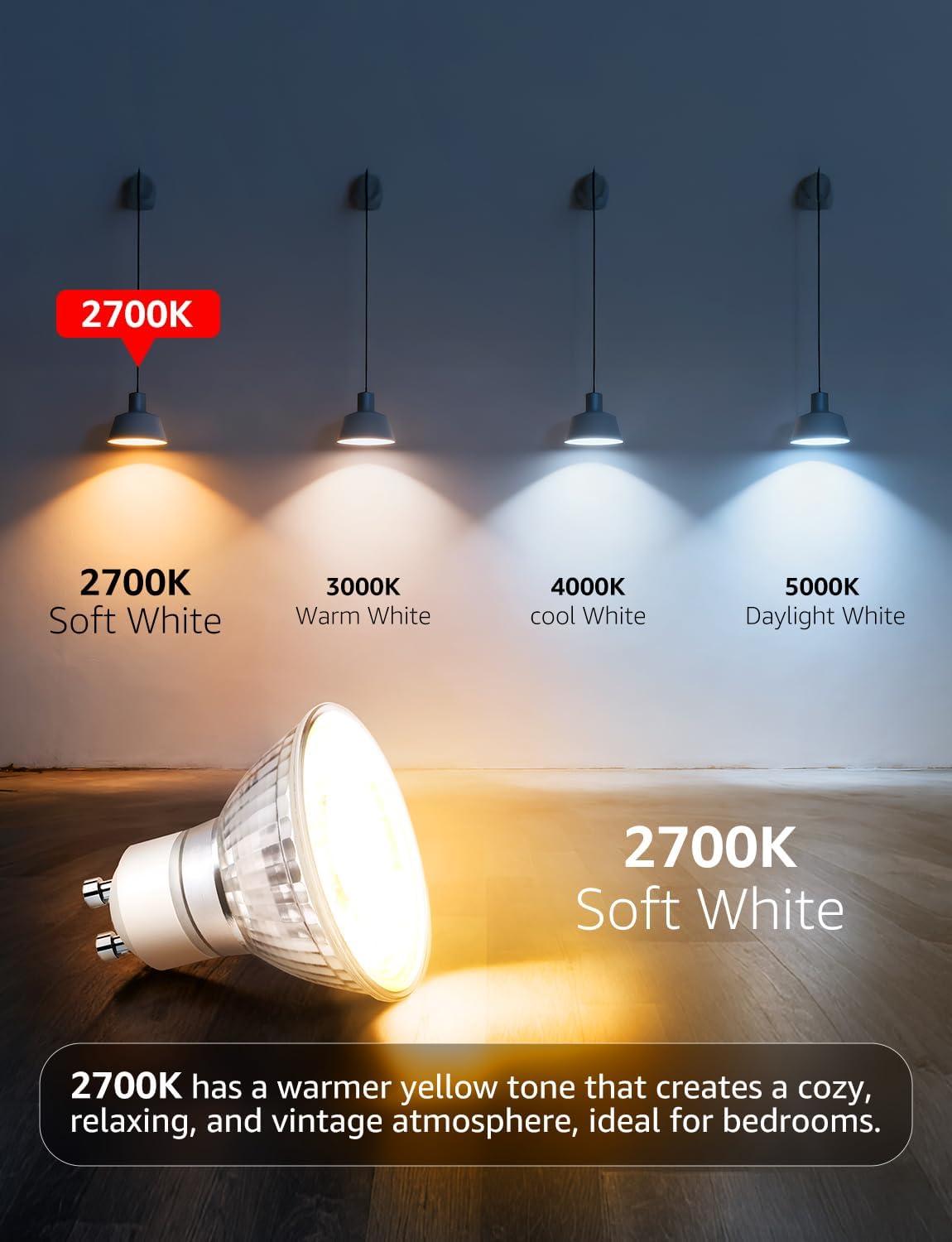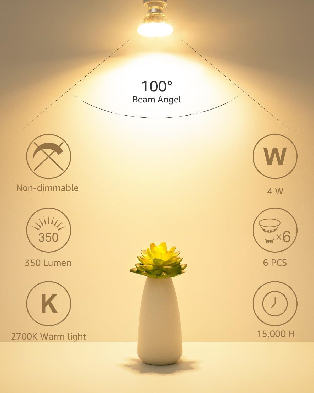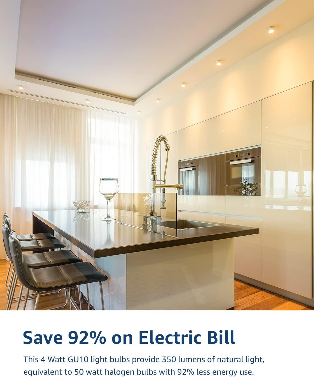 【Energy Efficient & Long Lasting】 4W GU10 LED bulbs replace 50W halogen bulbs, saving 90% on your electricity bill. With a lifespan of over 15,000 hours, they last 10 times longer than halogen and incandescent bulbs.