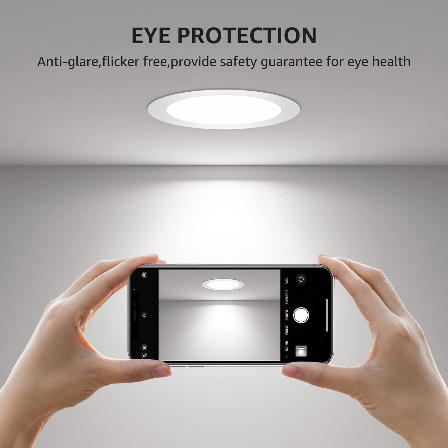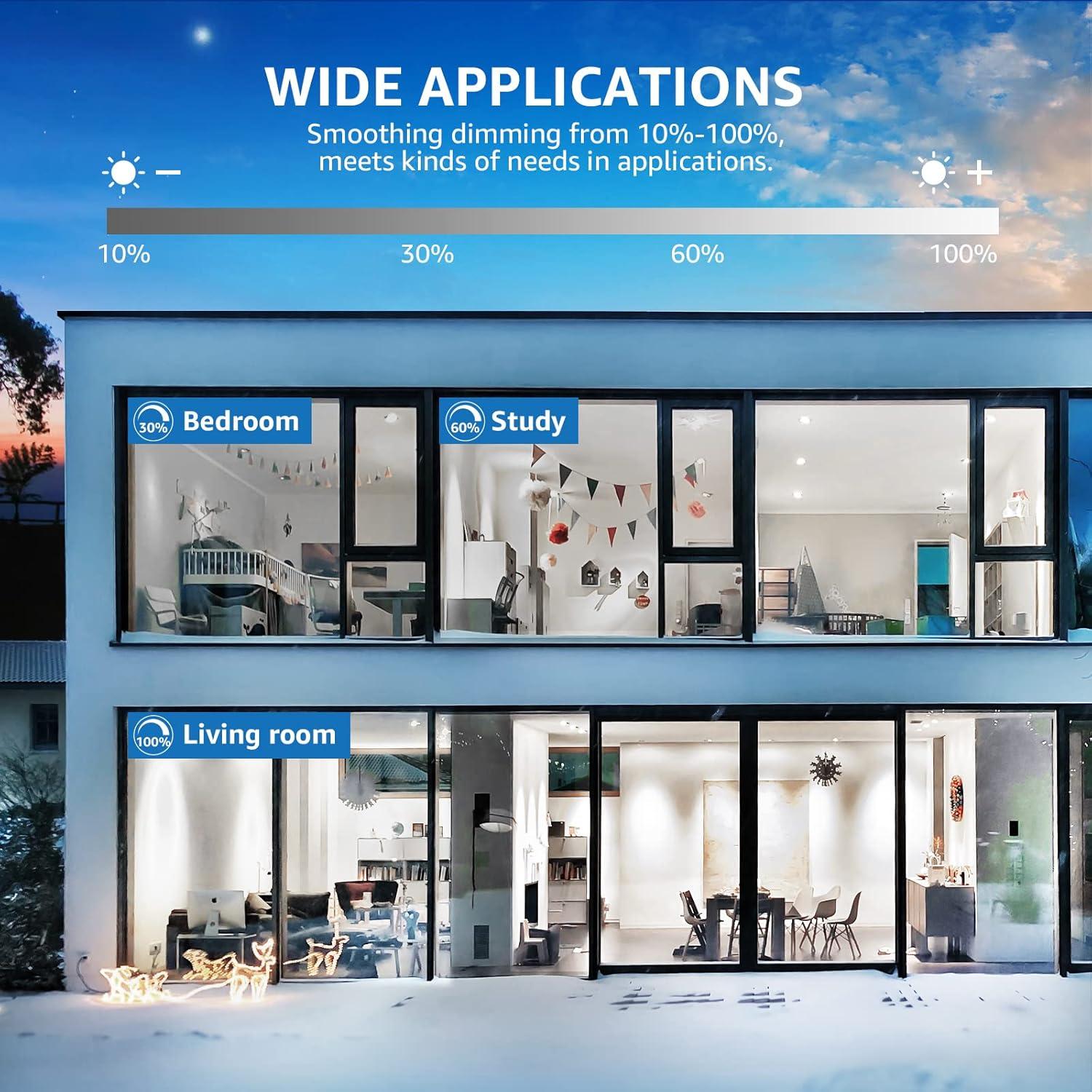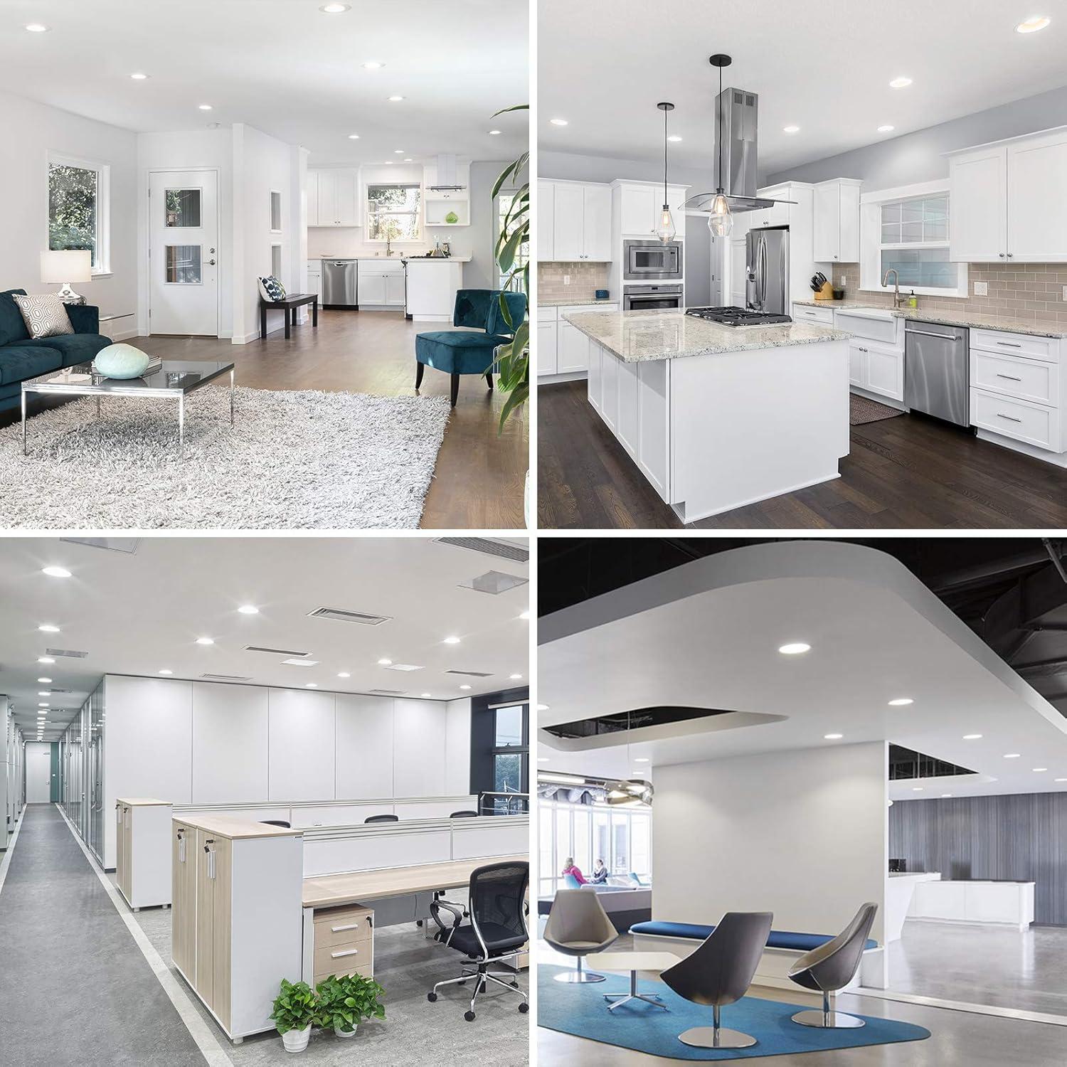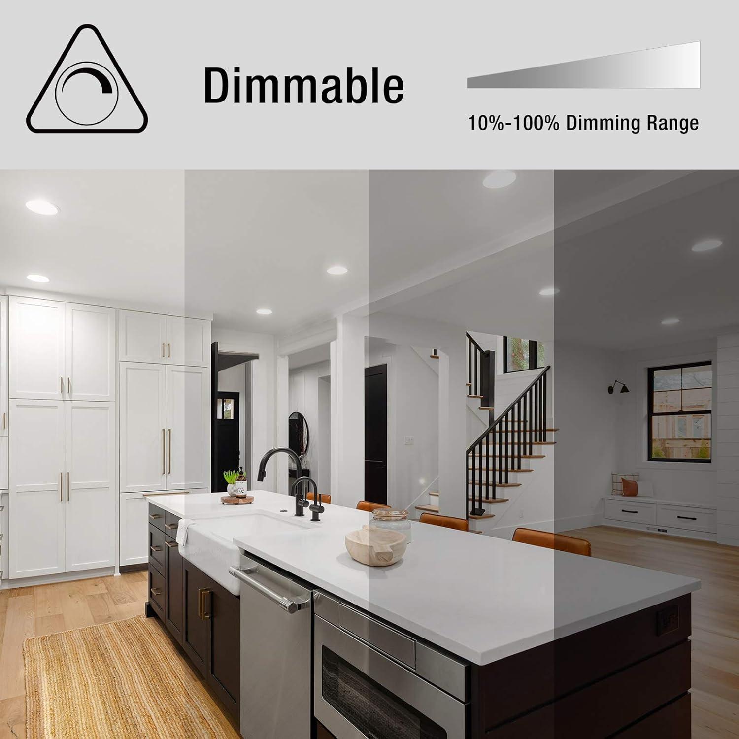 [Eyes friendly and dimmable] No flicker and noise, these 6 inch recessed lights are eyes friendly and compatible with most dimmer switches, allowing for smooth dimming from 10% to 100%. Suitable for damp locations, these lights can be used in various scenarios such as hallways, kitchens, bedrooms, living rooms, dining rooms, meeting rooms, offices, basements, and more.