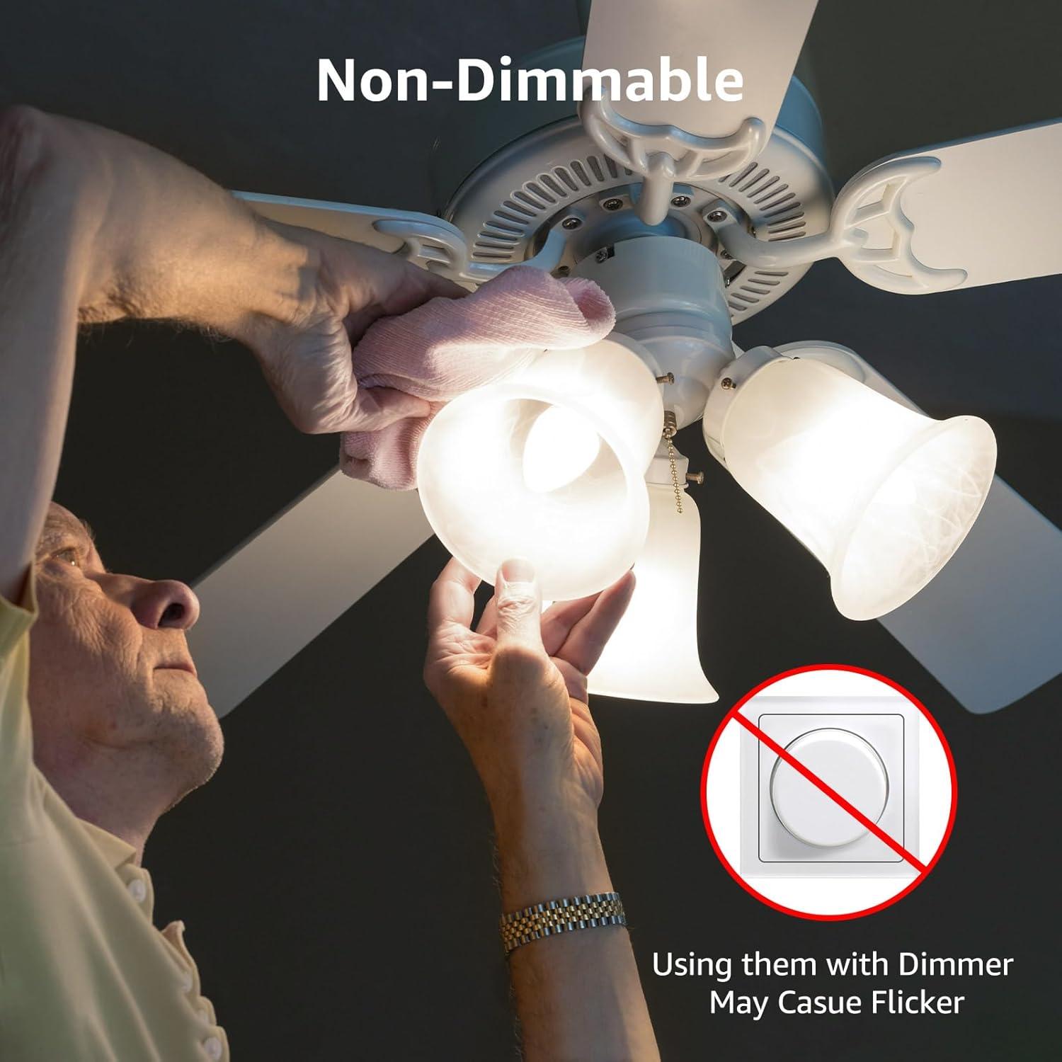 Save 86% on electricity energy and 5.5 watt: Save energy by replacing a 40 watt incandescent bulb with a 5.5 watt led bulb. Each ceiling fan light bulb provides a wide beam angle of 240° and a light output of 470 lumens.