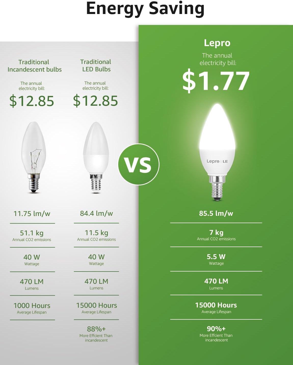 15,000 hours lifespan and shockproof: Lepro candle led light bulbs offer a long-lasting lighting solution with an expected lifespan of over 10 years (3 hours/day). The use of plastic material makes the e12 bulbs shockproof and less likely to break.
