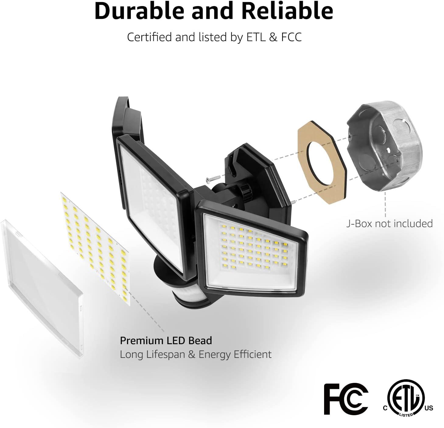 Durable & Reliable – This motion-activated outdoor light is rated for IP65 waterproof, it can withstand extreme weathers like rainstorm or snow. Lepro security lights are certified by ETL FCC, please purchase with confidence.