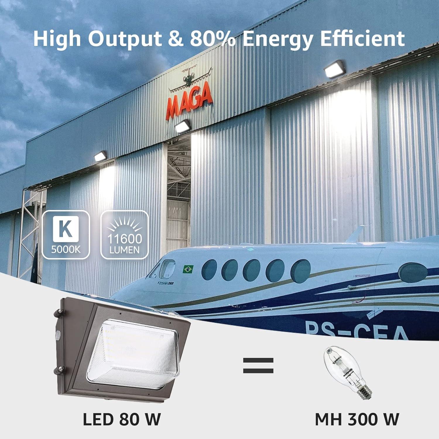 High Output and Energy Efficient – With the 145 Lumens / watt light efficiency, this 80W LED wall pack light provides 11,600 lm of daylight white 5000K light, which is equivalent to 300W MH/HPS and cut down the electric bill up to 73% instantly.