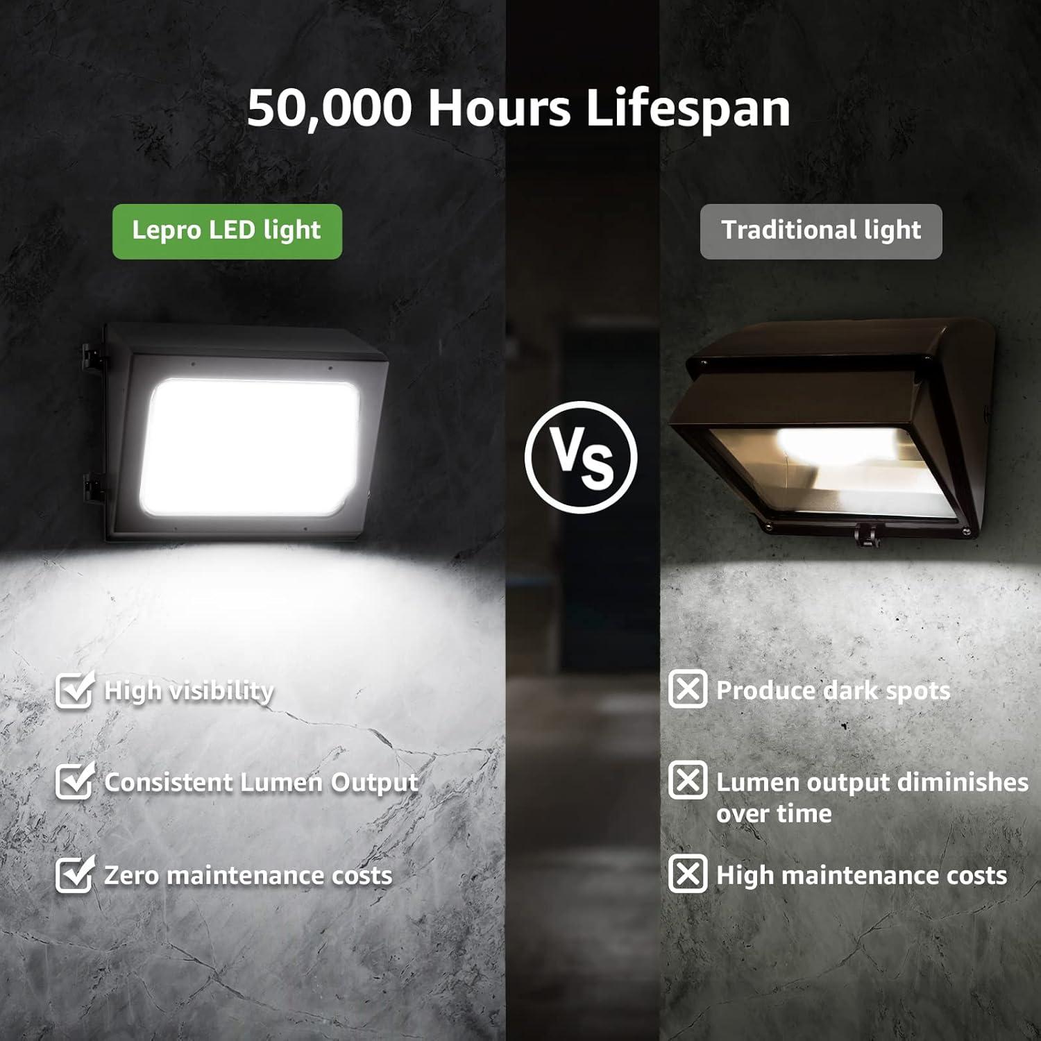 50,000 Hours Long Lifespan – Based on working 8 hours per day, it will provide you reliable bright light for 17 years or more. Unlike traditional MH wall packs, the LED light won't degrade over time. Save your time to replace light with low output.
